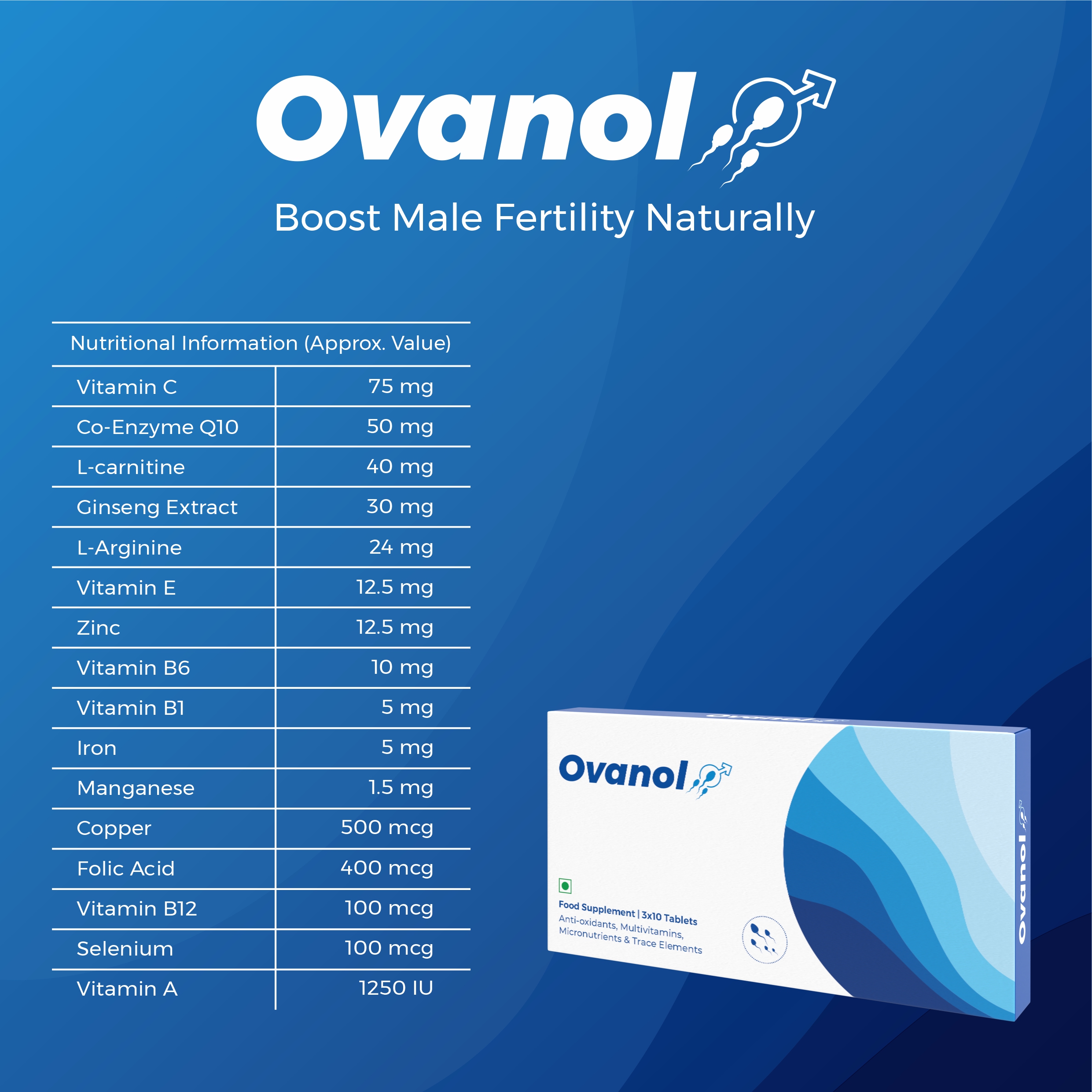 Ovanol Tablets are scientifically formulated to support male fertility by improving sperm health, motility, and quality. Enriched with antioxidants like Glutathione and Lycopene plus L-Carnitine, it reduces oxidative stress, enhances sperm morphology, concentration, and energy production. Regular use under medical supervision supports natural conception and overall male reproductive health safely and effectively.